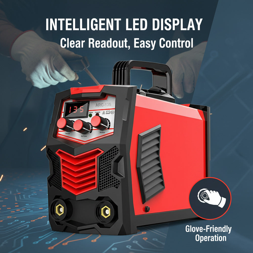 Intelligent LED Display: Features a large, high-visibility screen that clearly displays current amperage, function modes, and welding status. The control knob allows for precise value adjustments and is designed to be easily operated while wearing welding gloves.