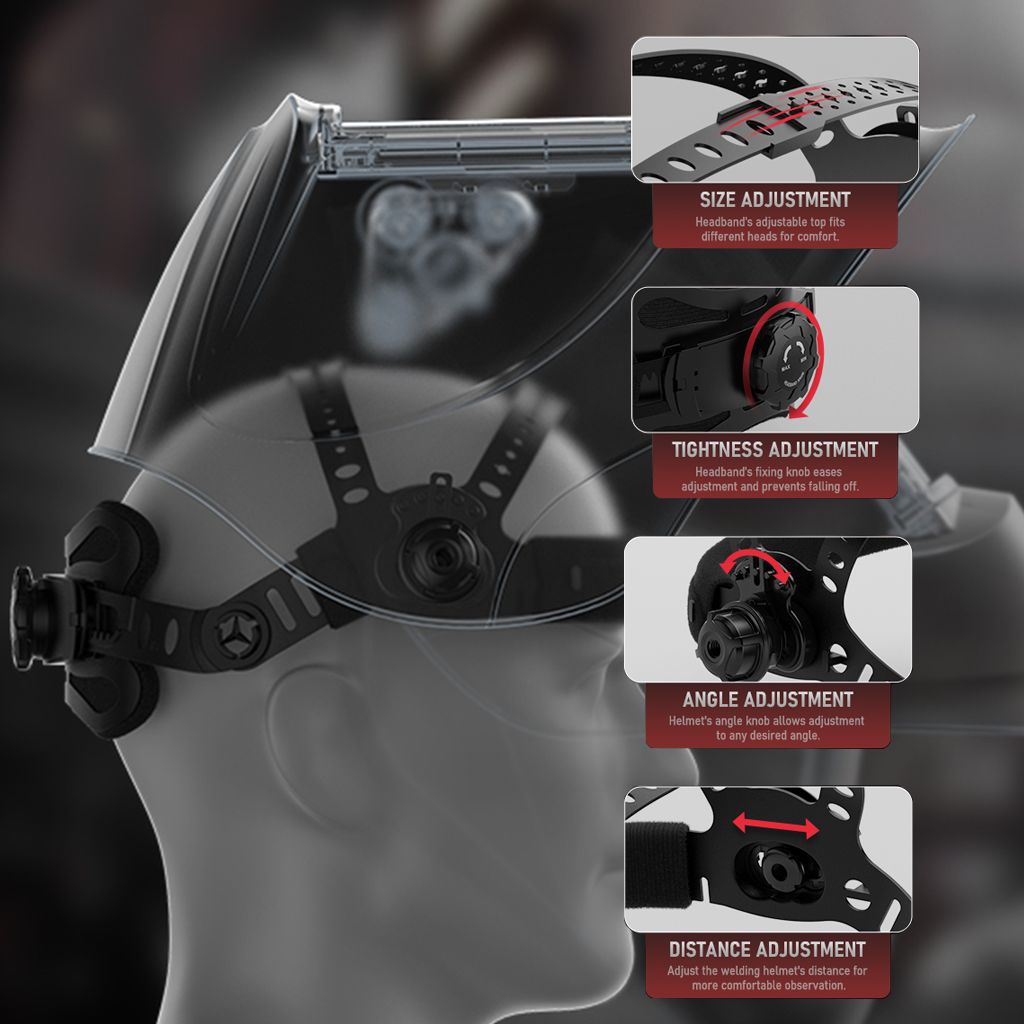 Ultra-Fast 4-Sensor Auto-Darkening: Equipped with four sensitive arc sensors for reliable ignition detection and lightning-fast reaction time (1/20,000 sec), ensuring instant shade transition from light (Shade 3/5) to dark (Shade 9–13) with adjustable sensitivity and delay controls.