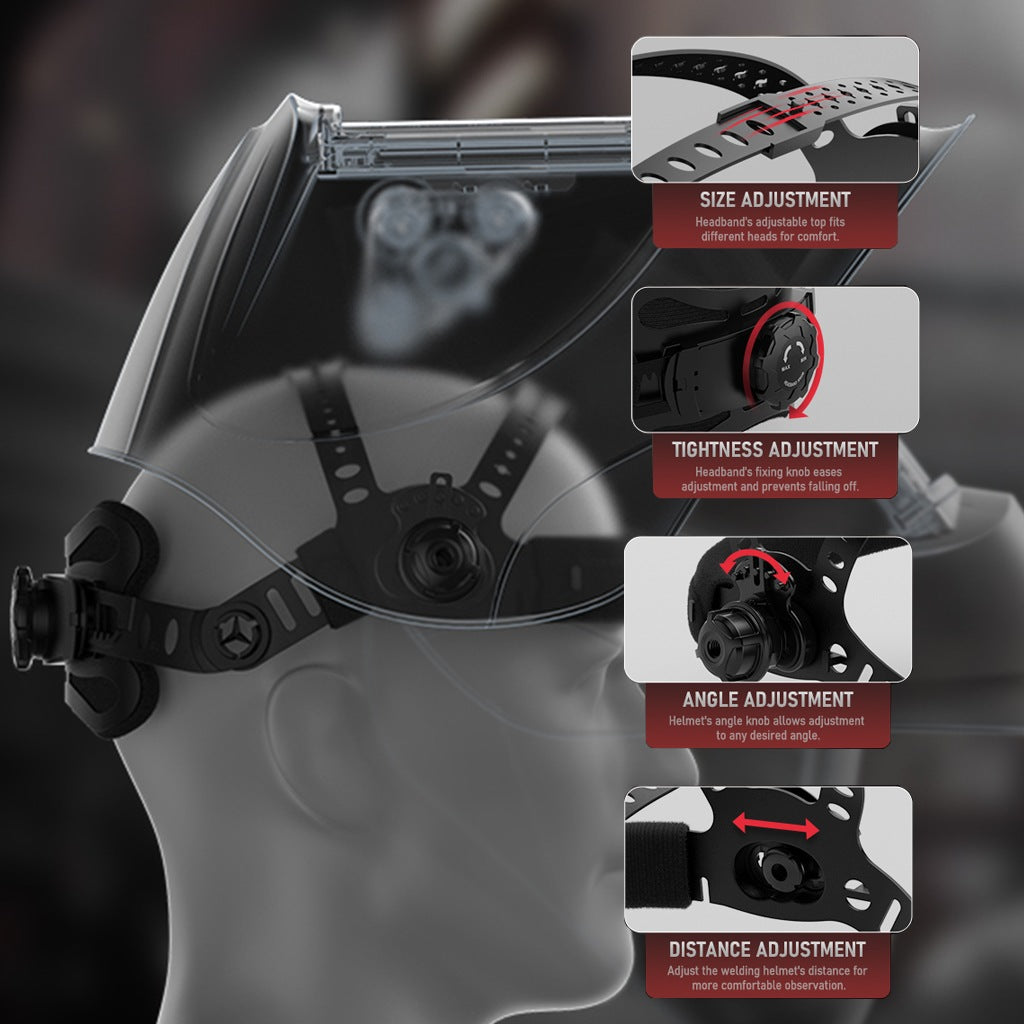 Comfort-Focused Headgear: Lightweight pivoting headgear with breathable padding reduces neck strain, providing an adjustable and comfortable fit for professional, all-day welding applications.